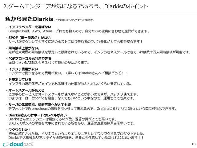 本田卓氏:他のリアルタイム通信エンジンからDiarkisへの載せ替えをサポートしたこともありますが、2週間から3週間ぐらいの期間で、簡単に載せ替えが可能でした。他社サービスとの大きな違いは、クラウドだと利用量が増えれば増えるほど費用が変わってくるというところが大きいですね。端的に言えばDiarkisさんのエンジンの方が、ユーザー数が増えた時のコストを抑える事ができると思います。