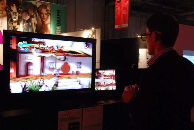 デジタルコンテンツエキスポ2009の「国際3D Fair」では、立体視によるゲームも出展されていました。その1つがバンダイナムコゲームスのブースで展示されていた『Invincible Tiger: The Legend of Han Tao』です。8月26日にXbox Liveアーケードで配信が始まった、Xbox Liveアーケードで初めての立体視ゲームで、主人公のタイガーとなって、カンフーの多彩な技を駆使して敵を倒していくアクションアドベンチャーです。開発はイギリスの Blitz Gamesで、「プリンスオブペルシャ」のような滑らかなキャラクターアニメーションと腰の入ったアクションゲームの要素が巧みに融合しており、古代の中国を舞台に、要塞や海賊船など6種類のステージが楽しめます。価格は1200MSポイントで、2人で協力プレーもできます。ゲーム画面は2Dの横スクロール形式ですが、ステージに格闘ゲームの「餓狼伝説」のように複数のラインがステージに設定されており、建物の中で戦いつつ、手前の庭に降りて木に登り、再び奥の屋根にジャンプして戦う、といった立体的なアクション体験が楽しめます。確かに立体視で遊ぶとステージが前後にグッと広がって、それだけで新鮮な感覚でした。また手前遠くの距離感が良くわかり、より自然なプレイが楽しめました。本作の立体視モードは「デジタル3D」と「アナグリフ3D」の2種類が選べます。前者ではデジタル3D表示に対応したディスプレイと偏光式3Dメガネが必要で、ヒュンダイ製の立体テレビなどに対応しています。後者では赤・青などの色のついた、市販品のアナグリフ式3Dメガネで遊べます。もちろん通常の2Dモードでもプレイできます。もう1つがNVIDIAブースで、スクウェア・エニックスのアクションアドベンチャー「バットマン アーカム・アサイラム」の立体視デモが行われていました。システムはハイエンドグラフィックボード「GTX 280」を搭載したPCと、ソリッドレイ研究所の3Dプロジェクター「Sight3D」の組み合わせで、同じくNVIDIA製のアクティブシャッター式3Dメガネ「3D Vision」をかけて楽しめます。この方式だと既存の全ての3Dゲームが立体視で楽しめます。3Dゲームのはずのバットマンが、3Dメガネをかけると立体に浮き上がり、より派手なアクションが楽しめました。同社では立体視ゲームなどが家庭で楽しめるNVIDIA 3D Visionを展開しており、350本以上のゲームに対応しています。ソニーが来年から立体視対応BRAVIAの提供を始めるなど、立体視ゲームは現在、非常にホットな話題の一つです。ただし対応ディスプレイを購入しなければならないのがネック。また何でも立体視にすればいいというものでもなく、立体視に最適化されたゲームデザインが求められます。ここはぜひ、まずアーケードゲームの大型筐体モノから、手軽に楽しめるようになりませんかね?