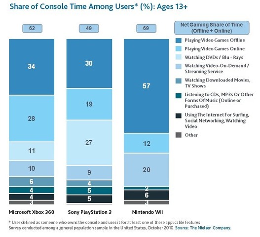 3大ゲーム機は使われ方にもそれぞれ特徴があるようです。米国の調査会社ニールセンは、Wii、プレイステーション3、Xbox360がどのように使われているかという調査結果をまとめています。今年10月に米国のゲーム機ユーザーを対象に行った調査で、それぞれのゲーム機の用途に関して日本のユーザーが見ても面白い結果が出ています。ゲーム機の総使用時間における、それぞれの用途の割合がチェックされていますが、トップ3を見ていきましょう。■Wii使用時間トップ3(ニールセンまとめ)オフラインでゲームをする:57%ストリーミングサービスで動画を見る:20%オンラインでゲームをする:12%■プレイステーション3使用時間トップ3(ニールセンまとめ)オフラインでゲームをする:30%DVD/ブルーレイの鑑賞:27%オンラインでゲームをする:19%■Xbox360使用時間トップ3(ニールセンまとめ)オフラインでゲームをする:34%オンラインでゲームをする:28%DVDの鑑賞:11%いずれのゲーム機もトップは「オフラインでゲームをする」ことですが、割合が大きく異なっています。興味深いのはXbox360におけるオンラインでゲームを遊ぶ率の高さで、オフラインでのゲームに近い時間が費やされていることになります。3種の据置ゲーム機の特徴が数値から見えてくるというわけで、日本で同様の調査が行われた場合にどういう結果が出るかも見てみたいですね。