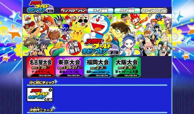 小学館は、最新のゲームやホビーが楽しめるイベント「次世代ワールドホビーフェア'13 Winter」の開催日を発表しました。次世代ワールドホビーフェアは、毎年冬と夏に行われている小学館主催のイベント。「日本最大級の子どものための展示会」をコンセプトに、今回も最新のゲームや玩具、キャラクターグッズを出展します。開催日は以下の通り。■次世代ワールドホビーフェア'11 Winter 開催スケジュール1月20日 名古屋大会(ナゴヤドーム)1月26日・27日 東京大会(幕張メッセ 国際展示場展示ホール9・10・11)2月3日 福岡大会(福岡Yahoo!JAPANドーム)2月10日 大阪大会(京セラドーム大阪)なお、出展情報などは12月中旬に公開予定。詳細はわかり次第お伝えします。