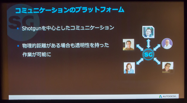 今回登壇したのは、Autodeskのプリセールスエンジニアである渡辺揮之氏です。Autodeskの「SHOTGUN」は、インターネット上で編集できるプロジェクト進捗管理機能を持ったツールで、FacebookやTwitterが組み合わさったようなコミュニケーション機能が備わっています。乱雑になってしまった進捗状況を整理することが可能となり、様々なユーザーがログインすることで最新のリアルタイムな進捗状況を観覧し、「SHOTGUN」内でコミュニケーションも可能になることで電子メールに依存しない情報の蓄積/検索ができます。優れた管理機能を有する「SHOTGUN」を導入したことによって「残業が減った」との報告もあるようです。