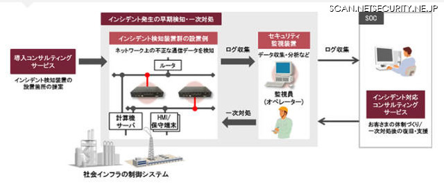制御システム内のネットワーク上に流れる不正な通信データを検知するためのインシデント検知装置群と、それらからデータを収集し、分析から一次対処までを行うセキュリティ監視装置を組み合わせて導入する。導入・利用にあたっては、インシデント検知装置の設置箇所を提案する導入コンサルティングサービスや、インシデントの一次対処後に行う復旧対応を支援するインシデント対応コンサルティングサービスと合わせて提供する。これにより、ユーザのシステムに最適なソリューションを提案できるとしている。