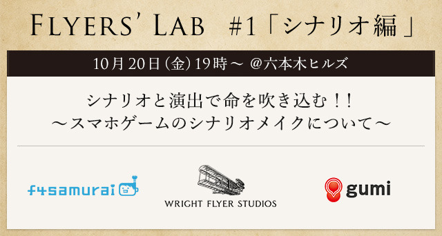 Wright Flyer Studiosはスマートフォンゲームシナリオ&演出家の交流会「Flyers' Lab(フライヤーズ ラボ)#1」を、10月20日に開催します。