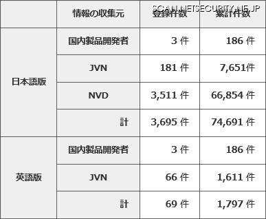 独立行政法人 情報処理推進機構(IPA)は10月24日、2017年第3四半期(7月から9月)における「脆弱性対策情報データベース『JVN iPedia』の登録状況」を発表した。発表によると、同期間にJVN iPedia日本語版へ登録された脆弱性対策情報は3,695件で、累計登録件数が74,691件となった。内訳は、国内製品開発者から収集したもの3件(公開開始からの累計は186件)、JVNから収集したもの181件(累計7,651件)、NVDから収集したもの3,511件(累計66,854件)となっている。登録件数は、前年同時期と比較して倍以上となっている。