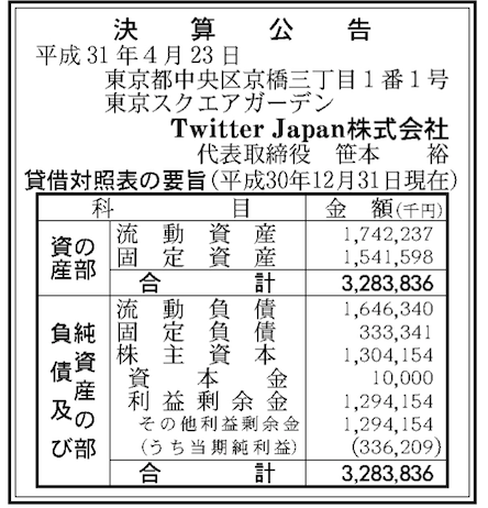 Twitter Japanは、2018年12月期の決算公告を官報を通じて発表しました。決算公告によると、当期純利益が3億3600万円となっています。同社が2018年12月に開いた事業戦略説明会によると、日本国内の売り上げは2018年1月~9月期の累計で412億円となっており、世界第2位のマーケットであると発表しています。