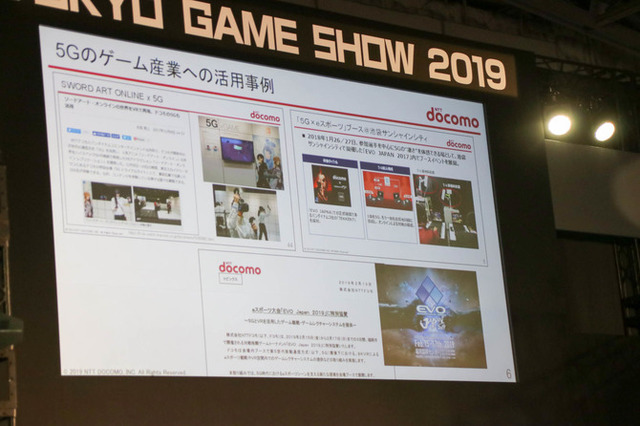 5Gのゲーム産業への活用事例としては、『ソードアート・オンライン』とのコラボや、「EVO Japan 2019」に特別協賛し5Gによる8KVR配信やVR空間でのレクチャーを提供したことが挙げられました。5Gの特徴である低遅延性は、オープンイノベーションクラウドにも活用され、社会的課題解決に結びつけていくとしています。