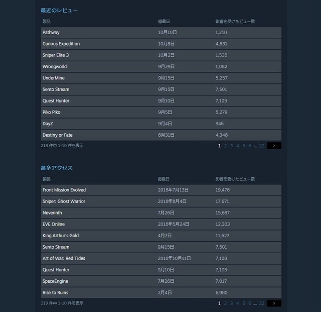 CurryDays氏個人的にはキュレーターの登録者数が重要だと思っています。キュレーター経由で日本語圏からのアクセスと購入が増えれば、インディー系開発者に日本語もお金になると意識してもらえるのではないかと考えています。ちなみに、キュレーターではこのような情報がわかります。
