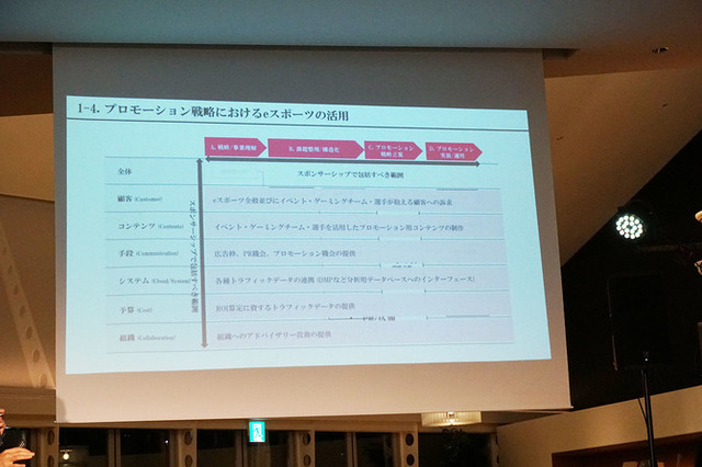 プロモーション戦略において考慮すべきことは、顧客、コンテンツ、手段、システム、予算、組織の6つ。e-Sportsのスポンサーシップには、これらすべてが関わってきます。中でも組織は重要です。e-Sports業界にはさまざまな人が関わっており、若い人も多い。彼らといかに相対するのか、自社の組織を見直す必要があります。