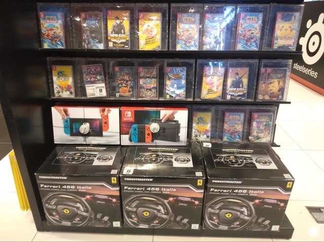 ここからは、エジプトにある大手小売店「Virgin Megastores」の様子を紹介していきます。過去に日本で展開していたCD・DVDショップですし、モロッコ編でも紹介していたので、ご存じの方も多いと思われます。筆者が取材したエジプトの店舗では、ニンテンドースイッチが2台しか販売されていませんでした。とは言えゲームはたくさん陳列されていますし、レースゲーム用のステアリングコントローラーも置いてあります。