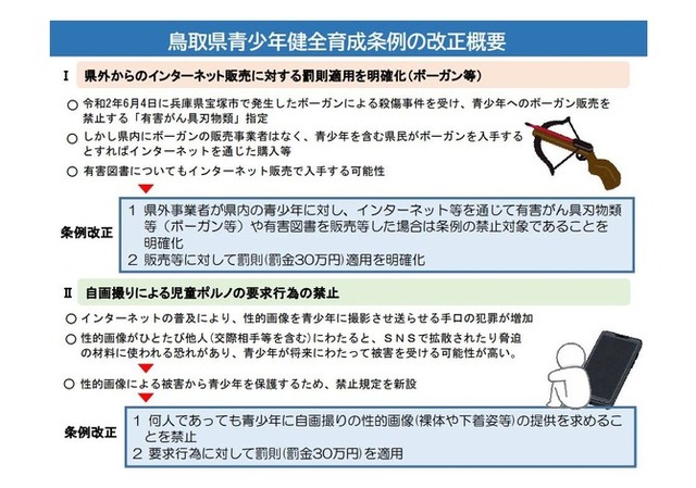 県では9月定例県議会に改正案を提出する予定。成立すれば青少年が鳥取県外からインターネットを通じて禁止対象物を購入した場合に、販売事業者に30万円の罰金が科せられるようになります。