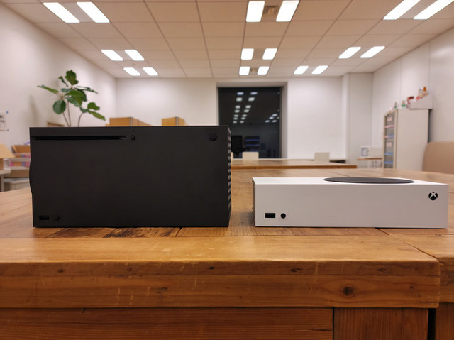 「Xbox Series X」と「Xbox Series S」のサイズ比較。写真の通り、かなりサイズ差があります。「Xbox Series S」の公称サイズは「6.5cm x 15.1cm x 27.5cm」。横置き時の高さがかなり変わってきます。そして重量も「Xbox Series S」は1.93kgと半分以下に収まっています。