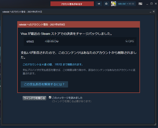 騒動の始まりは6月6日の21時40分頃、仕事を終えてMACからWindows環境に戻った時。Steamクライアントに見慣れたアカウント警告が発生したことから始まります。「見慣れた」という所に引っかかる読者の方もいらっしゃるでしょうが、実はこれはゲームライターあるあるの一つ。レビュー用のゲームキーをいただいた際、メーカーさんによっては後日にキーの無効化を行うケースがあり、その際にはまるでこちらが悪いことでもしたかのようにキーが取り消されたという「警告」が発生するのです。(正直、毎回心臓に悪いです)