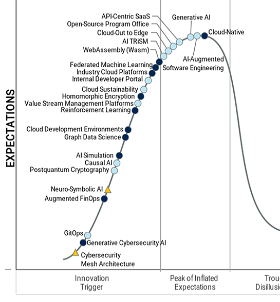 今年の特徴としては、これまでガートナーが発表してきた先進テクノロジーのハイプサイクルには、あまり名前を聞いたことがないような先進テクノロジーが比較的数多く並んでいたのですが、今年はそうした名称が少なく、GitOpsやWebAssembly、生的AIやCloud-Nativeなど、すでに多くのITエンジニアに聞き馴染みのあるキーワードが比較的保守的といえる場所に並んでいるところでしょう。