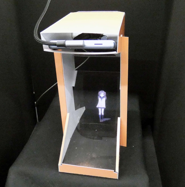 モーションシンクとは、入力された音声を読み取り、美少女キャラクターのリップシンクと同期させる技術で、より自然な口の動きを実現するもの。立体表現アプリは組み立て式のキットを使用したもので、Live2Dのアバターを表示させたスマートフォンをセットすることで疑似的な立体映像が楽しめます。