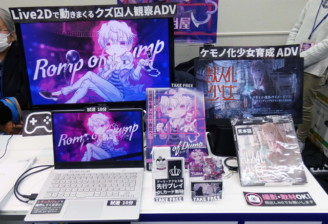 クリエイターマーケットで異彩を放っていたのが、唯一のゲーム作品参加というザクロスケさん。インディーゲームを制作する個人サークル「ザクロ弁当屋」の運営をしており、Live2Dをフル活用した「クズ囚人観察ADV 『Romp Of Dump』」の試遊コーナーを設置していました。