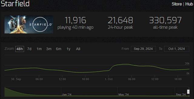 2024年2月にはGame*Sparkでも、ピーク時に33万273人を記録した「『Starfield』の同時接続プレイヤー数が“97%減少”」と報じましたが、直近48時間のプレイヤー数は約1万1千人と確かにふるわない数字と言えるでしょう。