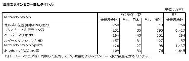 ソフトウェアについては、『ゼルダの伝説知恵のかりもの』の258万本を筆頭に、『ペーパーマリオRPG』の194万本、『ルイージマンション2 HD』の157万本と、新作タイトルが順調な販売数を記録。