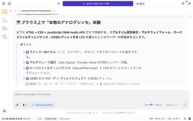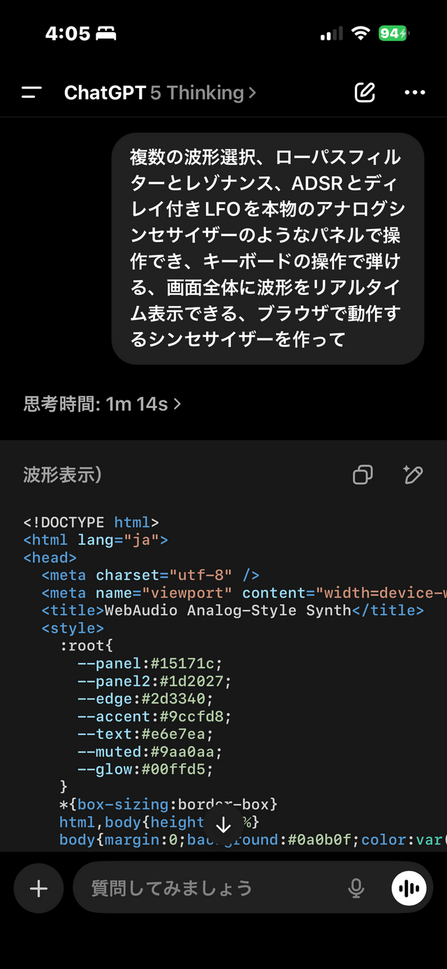 次に、プログラミングです。Claude Artifactsが出てきた時から取り組んでいる、アナログシンセサイザーの模倣をやってみます。