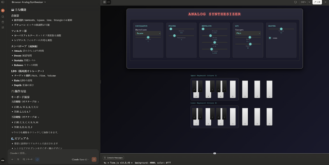 Claude Artifactsはヴァイブコーディングの元祖的なもので、筆者も手慣れているのですが、波形のリアルタイム描画は実装できませんでした。また、鍵盤のレイアウトもおかしく、キーマッピングに合致していません。