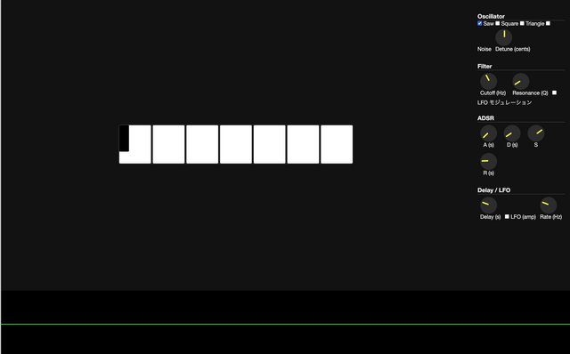 複数の波形選択、ローパスフィルターとレゾナンス、ADSRとLFOを本物のアナログシンセサイザーのようなパネルで操作でき、キーボードの操作で2段鍵盤で弾ける、画面全体に波形をリアルタイム表示できる、ブラウザで動作するシンセサイザーを作って
