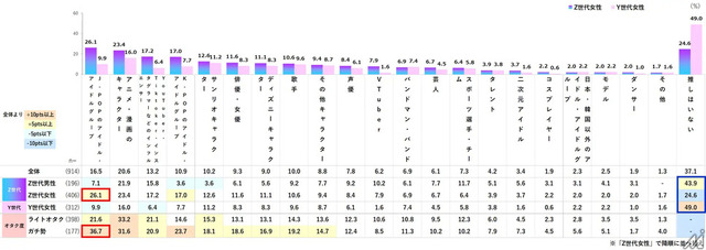 推しのジャンルについては、Z世代女性およびガチ勢において「J-POPアイドル・アイドルグループ」が1位となりました。近年のアイドルオーディション番組の頻繁な開催や、男女問わず多くのアイドルグループの存在、SNS等での話題性の高さが影響していると考えられます。