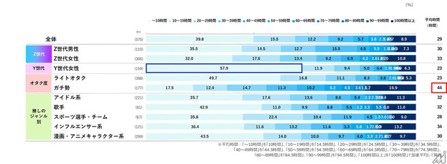 時間については、Y世代女性は10時間以下選択者が57.9%を占めており、Z世代よりも時間をかけない人が多い結果となりました。家族との時間も多くなり、推し活にかける時間が少ない様子が伺えます。また、ガチ勢は平均時間が44時間という結果となり、日常生活の中でも推し活をすることが当たり前になっていることが考えられます。