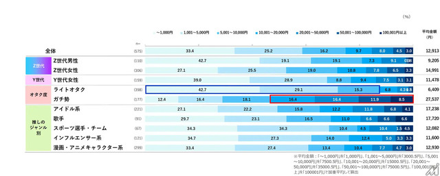 調査結果によると、推しがいる人の割合はZ世代女性が75.4%と最も高く、Z世代男性の56.1%、Y世代女性の51%を大きく上回りました。Z世代女性は推し活にかける時間・費用の平均も多く、他の世代・性別と比較して積極的な投資姿勢を示しています。