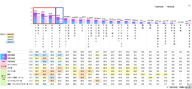 推し活での情報収集源について確認したところ、全体として公式SNSが上位に挙がっており、性別・年代・オタク度・ジャンル関係なく使用されていることが分かりました。その中でも公式Xがほとんどの世代・性別・ジャンルで1位を占める結果となりました。