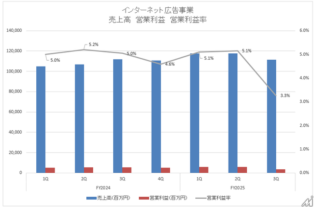 インターネット広告事業の利益率は1.7ポイントも低い3.3%に