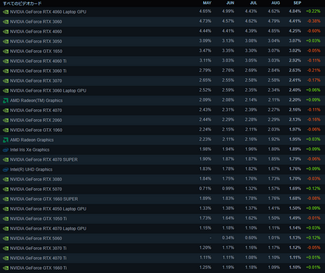 Valveは、Steamハードウェア&ソフトウェア調査の2025年9月版データを公開しました。「GeForce RTX 50」シリーズのシェアが上昇しているほか、VRAMでは8GBの需要が減少しつつあります。