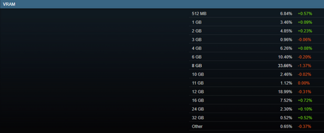 VRAMにおいては8GBが未だ最多であるものの、シェア率は前月比で1.37%減少して33.66%に。一方で16GBは0.72%上昇し7.52%に達するなど、徐々に8GB以外へと移行する様子を見せています。