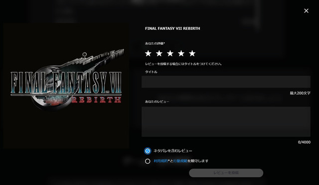PSストアでは、基本的に作品の評価は「☆」による5段階の評価のみ行われてきました。これまでは『FF7 リバース』や『HELLDIVERS 2』、『原神』など、一部タイトルに関してのみレビュー機能が試験的開放されており、レビューを投稿できるのはデジタル版を所有している一部のユーザーに限られていました。