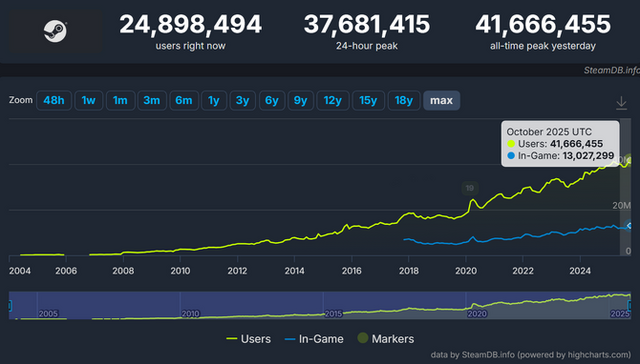 2025年10月12日、Steamの同時接続者数が史上最多となる41,666,455人(4,166万人)を記録しました。Steam DB調べです。