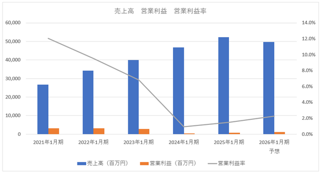 2023年1月期に6.8%だった営業利益率は、2024年1月期には1.0%まで低下しました。