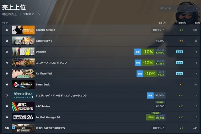 また、Steamのセールスランキングの売上上位では、日本国内で1位、グローバル版では4位とこちらも好調な記録をみせています。