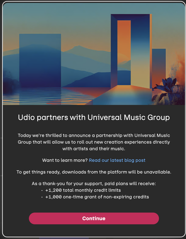 Udioは今後数カ月間、モデルと機能の大幅アップデートを行う「移行期間」に入り、当面は楽曲のダウンロード機能が停止。有料ユーザーには以下の特典が提供されます。