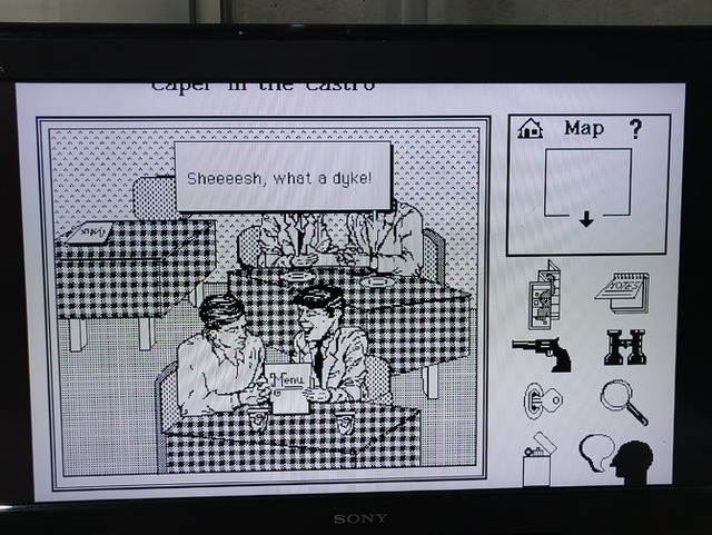 『Caper in the Castro』はそのシステムが特徴的。基本的には街中を歩き、人々から情報を収集していくのですが、その方法は様々なものがあります。プレイヤー自身によるテキスト入力によってNPCに話しかけるだけでなく、銃を撃つ、ピッキングなどのコマンドが存在。これによって鍵のかかった場所を鍵ごと壊したり、相手からの攻撃に対応することができるのです。
