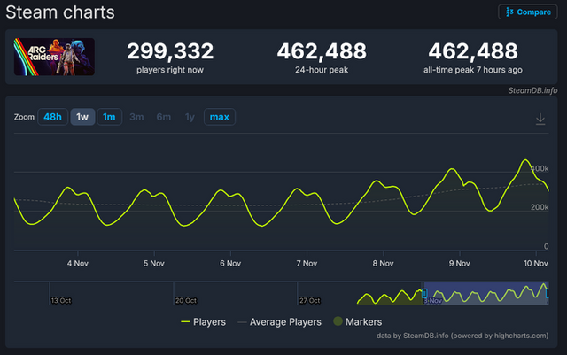2025年11月10日14時時点で、PvPvE脱出シューター『ARC Raiders』のSteam最大同時接続数が462,488人を記録し、24時間のSteam最大同時接続数で第4位となっています。