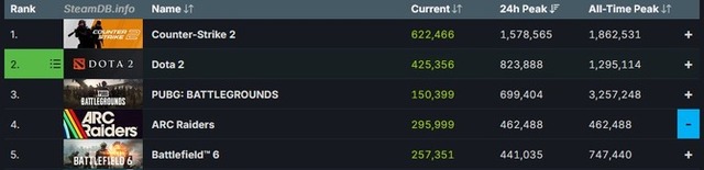 24時間の最大同時接続数で見てみると、本作は『Counter-Strike 2』『Dota 2』『PUBG』と不動の御三家に次ぐ4位を記録しており、なんと『バトルフィールド 6』の24時間最大同接数を上回っています。