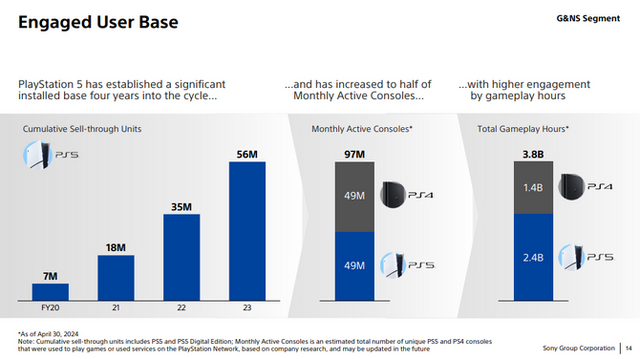 これに関しては、2024年5月のゲーム&ネットワークサービス分野における事業プレゼンテーション(英語版のみ)でも、月間のアクティブコンソールユーザー数のちょうど半数をPS4ユーザーが占めているというデータが示されています。