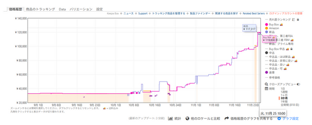 この背景としてAI需要が考えられており、実際に有志によるAmazon市場価格追跡ツール「Keepa」で見てみると、日本でも10月から11月にかけて価格が2~3倍になっているメモリが確認できます。