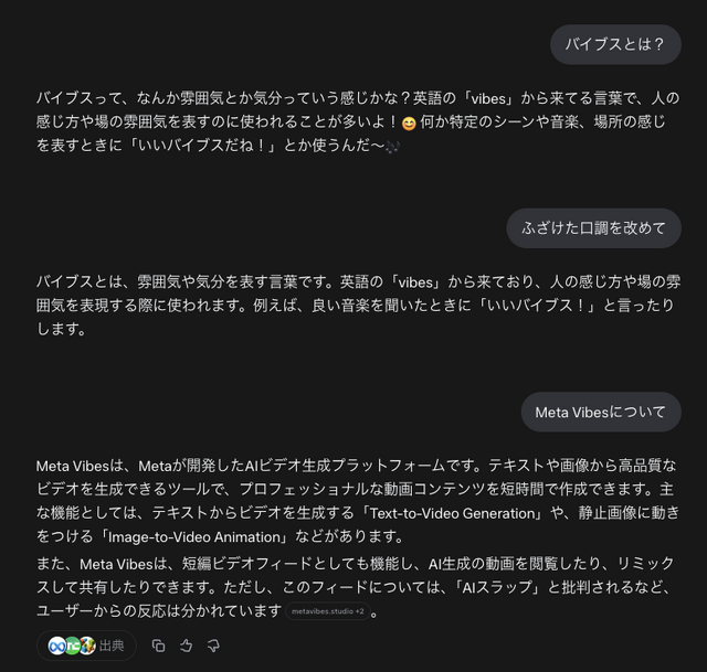 さらに現在では、Metaが一般ユーザーのAI利用を促進するための手段として、OpenAI SoraアプリとそっくりなVibesを統合したため「AI生成短尺動画無限スクロールアプリ+AIチャット+スマートグラス管理アプリ」という、謎の存在に進化を遂げています。