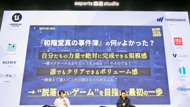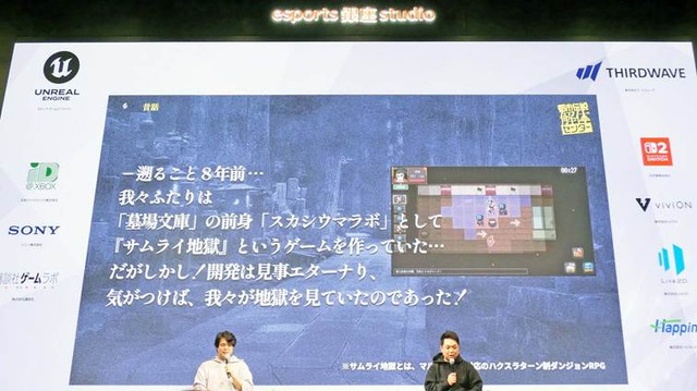 登壇者はインディーゲーム開発チーム「墓場文庫」のグラフィッカー・デザイナーの「ハフハフ・おでーん」氏、プログラマーの「モチキン」氏。なおシナリオ・キャラデザインを担当した「きっきゃわー」氏と、BGM・SE担当の「あだP」氏は出席しておらず、墓場文庫設立前からコンビで開発に取り組んでいた「ハフハフ・おでーん」氏と「モチキン」氏の2人での講演となります。