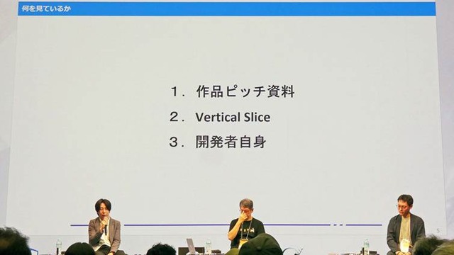 それでは実際に、どのような資料をもとに検討がされるのか?目を通す資料は「作品ピッチ資料」と「Vertical Slice」。さらに「開発者自身」も対象です。