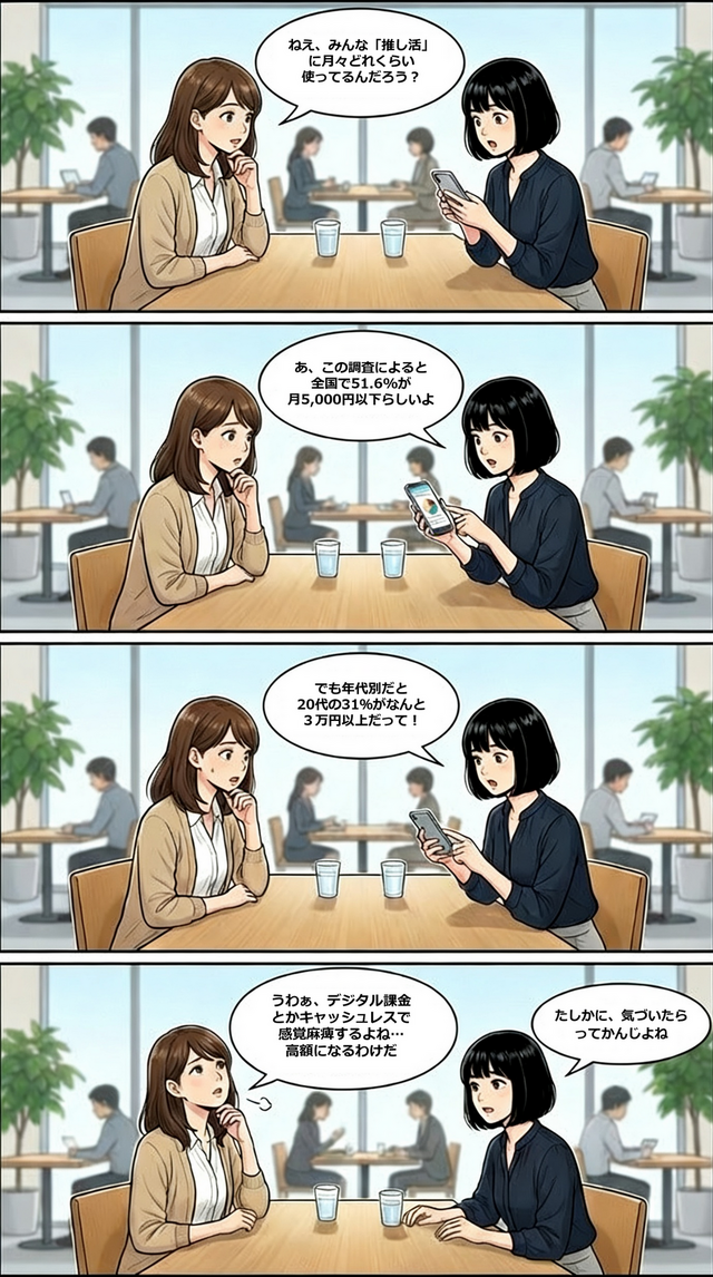 調査によると、最多は「~5,000円」で51.6%、次いで「5,001円~10,000円」が18.4%となり、約7割が月1万円未満で推し活を楽しんでいることが分かりました。