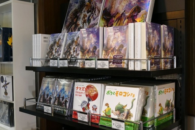 書籍コーナーでは公式画集や世界設定本「Encyclopaedia Eorzea」、絵本シリーズなども取り揃えています。
