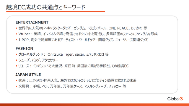 これまで日本から数々の物販を行ってきたGlobal-eの視点で見る「越境EC成功の共通点とキーワード」も紹介されました。1つ目のポイントは前出のエンタメ業界。やはりその人気は高く、日本が持つ世界的に人気のIP・キャラクターグッズの存在は重要なキーワードになっているとのことです。