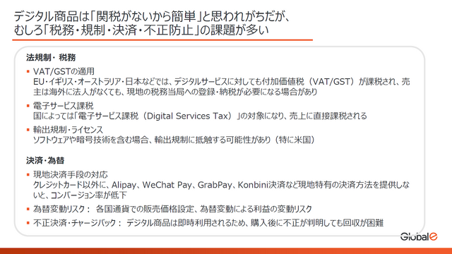 グッズなど形ある物とは違い「関税が無いので簡単なのでは」と思われることもあるデジタル商品ですが、通関が発生しないことでかえって専門的な対応が必要になります。デジタル商品販売は国ごとにさまざまな納税業務が発生しますが、神吉氏は「登記だけで3000万円くらい必要になる国もある」と、その納税作業の大変さ・複雑さを解説しました。