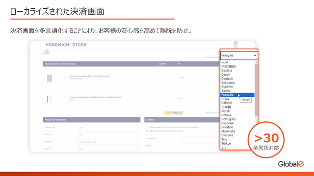 続いて神吉氏は「決済画面は意外と重要で、物販では多言語対応するとコンバージョン率が上がる」というデータも紹介。Global-eでは決済画面のローカライズにも対応しており、ユーザーの離脱を防止することもできます。