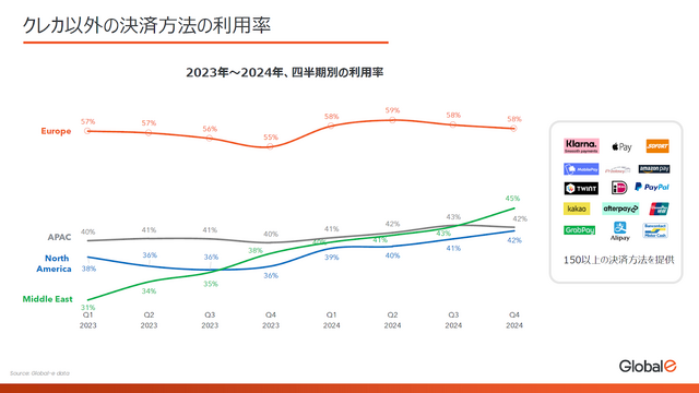そして神吉氏は「海外ではクレジットカードが使われなくなりつつある」という実情もデータと共に紹介。ヨーロッパでは58%がクレジットカード以外の決済方法を利用しており、APACは42%、中東でも45%にのぼり、グラフを見ても増加傾向にあることが分かります。